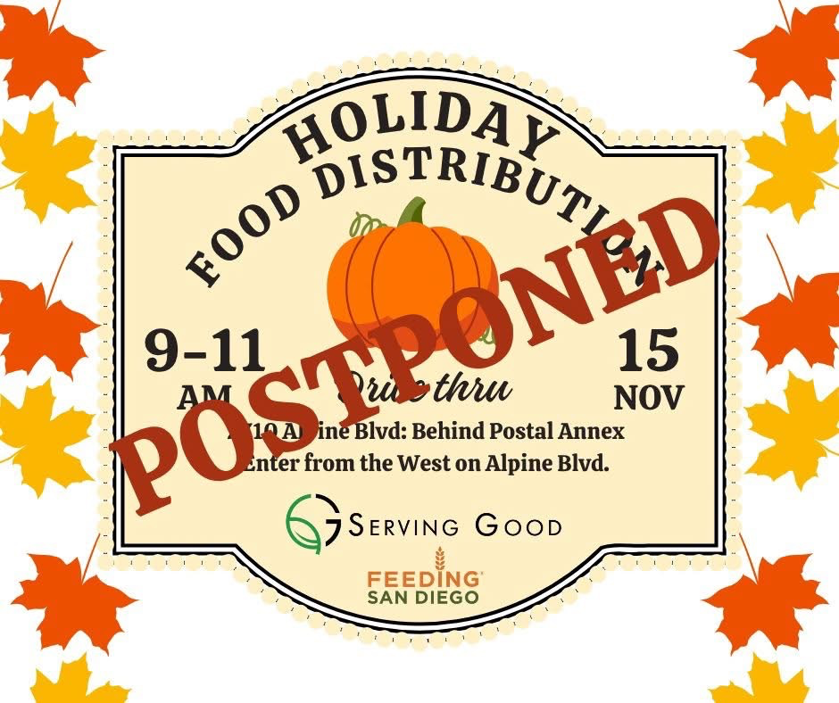 We have postponed our free food distribution to a later date because of severe weather. Rain and wind for November 15th has been forecasted, which inhibits our ability to serve everyone through our outdoor, drive up food distribution. We are currently working on setting a new date.. The location at Postal Annex in Alpine will be the same. Check back for more details.